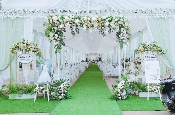 Vì hoa cỏ thường mang màu xanh khá nổi nên phông rạp được lựa chọn nên là màu trắng hoặc xanh green nhạt.